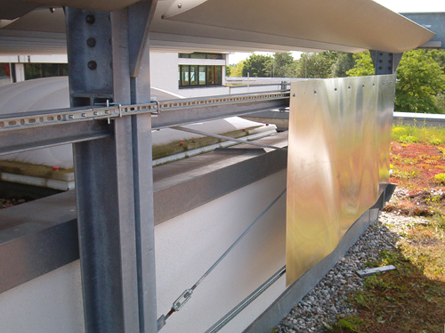 Photovoltaik Aufbau einer Photovoltaikanlage Bau der Wechselrichterplätze zwischen Stahlträgern mit Montageplatten sowie der Kabelführung auf das Schuldach in Form einer Kabelrinne auf dem darunter liegenden Schuldach Foto: Achim Voß |